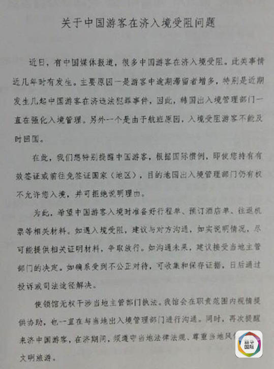 在8日下午回应“中国游客在济入境受阻问题”的说明中,中国驻济州岛总领事馆除了提醒中国游客随身携带必要的旅行入境材料外,同时强调,在济州岛旅游期间,中国游客须遵守当地法律法规、尊重当地风俗习惯,做到文明出游。