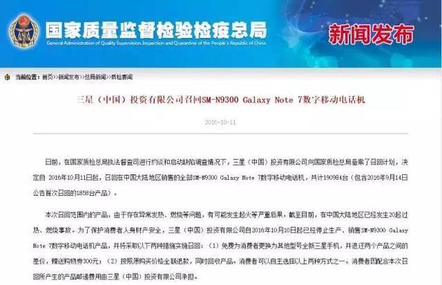 据国家质检总局官网披露,在执法督查司进行约谈和启动缺陷调查情况下,三星(中国)投资有限公司向国家质检总局备案了召回计划,决定自2016年10月11日起,召回在中国大陆地区销售的全部SM-N9300 Galaxy Note 7数字移动电话机,共计190984台(包含2016年9月14日公告首次召回的1858台产品)。