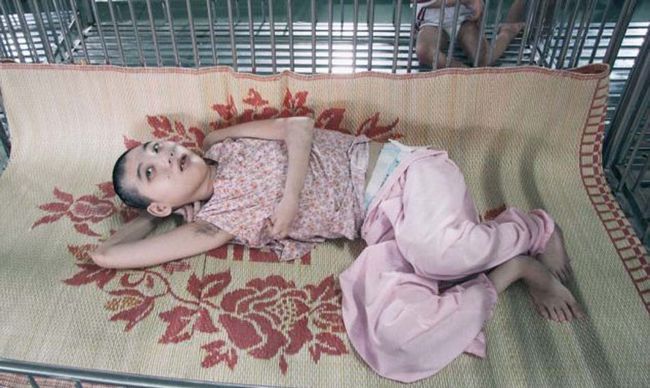 在落叶剂影响下的残疾儿童,主要包括肢体缺失、发育不良、脊柱弯曲,也有一些孩子是聋哑盲人,多数人卧床不起。图为:一个孩子躺在床上不能起来。