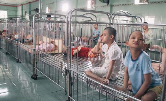 许多孩子因身体畸形或精神障碍被家人抛弃。越南胡志明市“和平村庄”,是一所专门收留被遗毒致残儿童的中心。图为:收留在中心的残障儿童。