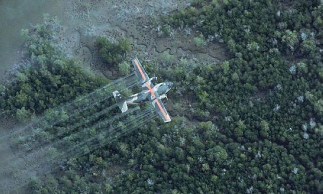 在1962年到1971年之间,美军在越南部分地区,喷洒了大约2000万加仑落叶剂,其目的是毁掉森林,剥夺游击队藏身之地,并切断他们的食物供应。图为:当年喷洒落叶剂的美军飞机。