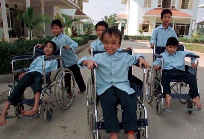 据越南官方统计,数十年来,约有100万人受到这种化学物质影响,15万儿童造成了先天性生理缺陷。图为:坐在轮椅里的孩子们,前面那个男孩在微笑,看着令人心酸。