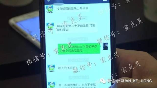 初二的时候,凶手发消息给母亲,说当天从香港回来会来拜年,然后母亲发消息问什么时候回来,回答说还在飞机场还没有起飞,到上海大概要到晚上9点多。