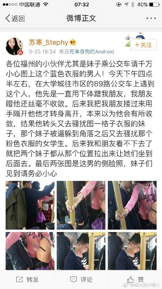 25日,福州一名微博网友"苏寒"微博称,一男子在89路公交车上,用下体蹭多名女乘客,同时还曝光了现场照片,帖子发出后,又有多名网友表示,该男子是"惯犯",多次在大学城公交路线上骚扰女生。