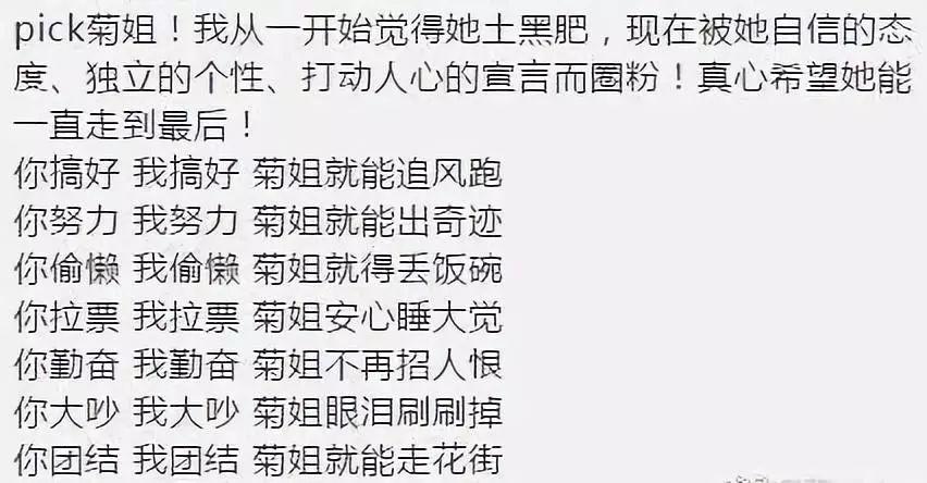 迄今为止,我只为两个人投过票,孟美岐我是每周都投,后来全名PICK王菊的时候,我也给菊姐贡献了一点,可惜没有差评,如果有差评,我绝壁要投给杨超越。