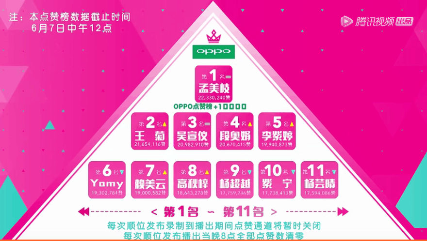 上周六的节目播出时,票数还停留在6月7日,当时登顶的依然是孟美岐,而菊姐一路逆袭已经到了第二的位置,和孟美岐仅仅差了700万票,孟美岐第一的位置岌岌可危。