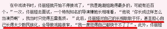 在中戏读书时,丫丫出去递资料跑戏,有一个知名导演嫌她长得难看(这导演也是瞎),这事一直让她耿耿于怀,以为自己的长相太少数民族化,会使得以后戏路变窄。