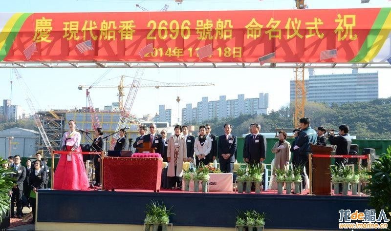 中国海运(集团)总公司(简称中国海运)董事长、党组书记许立荣先生与集团有关领导、驻韩国邱国洪大使、现代重工集团代表、国内主要港口代表及社会各界嘉宾一同出席了本次交船仪式,共同见证了新船命名与交付。仪式上,新船教母何丽君女士为“中海环球”号进行了命名,现代重工崔吉善会长致欢迎词,许立荣先生发表了讲话,中海集装箱运输股份有限公司(简称中海集运)董事总经理赵宏舟先生作为船东代表向船厂5名杰出员工进行了表彰并赠送纪念品。