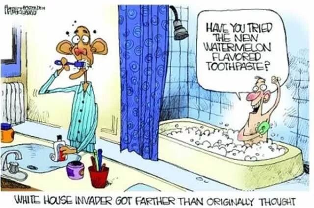 2014年,《波士顿先驱报》为了讽刺白宫保安办事不力,公布了一张漫画,画面里一位推销员跑进白宫,坐在浴缸里向奥巴马推销西瓜口胃的牙膏。这简直是……求奥巴马心理阴影面积。所以报社赶紧道歉,并把漫画里的西瓜味牙膏改成了草莓味牙膏。