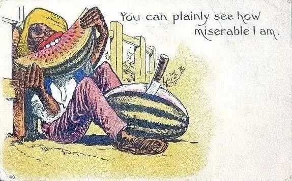 南北战争末期,很多获得自由的黑人靠种植和贩卖西瓜养活自己,这时候偏见深的白人农场主看他们不顺眼,通过西瓜来丑化黑人的形象。因为西瓜营养价值不算高,容易种植,所以他们给西瓜贴上了“懒惰”,“堕落”的标签,制作了大批丑化黑人形象的宣传海报。这种借西瓜讽刺黑人的梗就这样在白人文化里代代相传,频繁使用,直到现在,黑人兄弟听到这个字眼依然觉得很受伤。