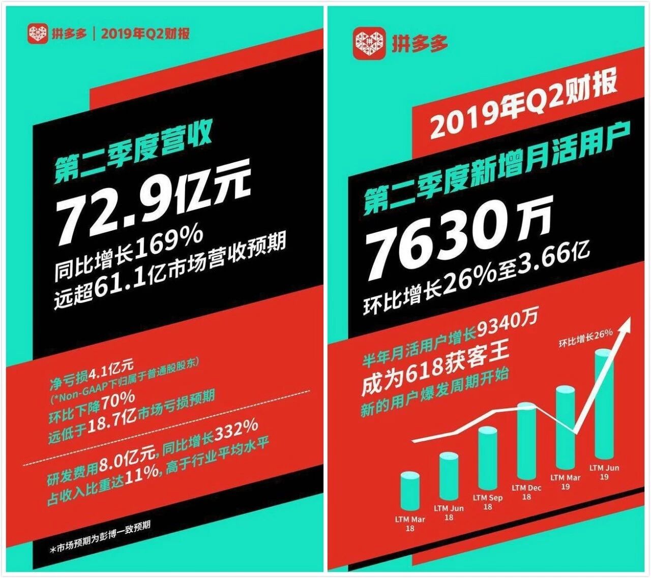 拼多多从成立开始,就以三四线城市为主战场,针对Q2财报,拼多多战略副总裁九鼎表示:“2019年下半年,我们将继续扩大让利和补贴力度。”同时,拼多多Q2财报显示在第二季度,拼多多的年活跃用户达到4.83亿,在电商市场整体流量增速缓慢的大趋势下,拼多多的这一逆势增长现象成为最大亮点。