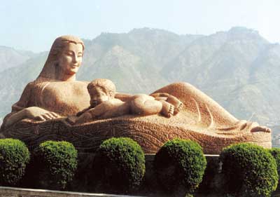 (在黄河岸边游览时,正好碰到兰州市电视台的记者在采访黄河母亲塑像的设计者,她在指导修葺塑像)