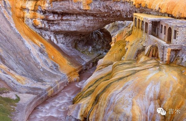 阿根廷门多萨省的印卡石桥,桥上覆盖满了亮橘色和黄色的细菌。