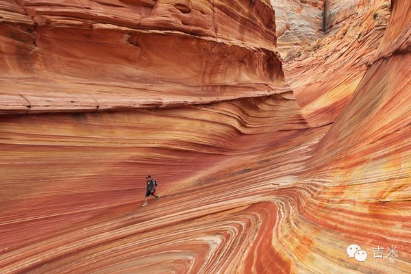 闭上眼睛,想象着自己走进了一个棕黄色的大桶里面,梦幻般的漩涡,像一块要溶化的岩石巧克力。波涛谷就像一个巨大的奥运会的游泳池,墙面是让人眩晕的波形,由煅黄土和粉色、棕色、浅绿色的材料组成。波涛谷的纹路大部分都是水平走向,有些地方会呈“Z”字形。