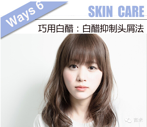 白醋抑制头屑法:每晚睡觉前,用1:1的食醋和清水在头皮屑生长点涂抹,轻轻揉搓发根部,10分钟后,用清水洗净。这样可以抑制头屑过多生长,并最终根治。用加入食醋的温水洗发也有效果。