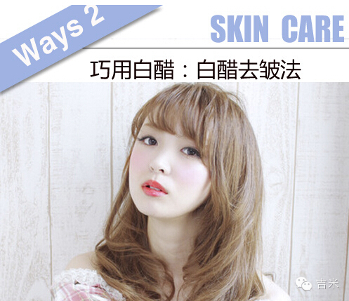 白醋去皱法:白醋能够减轻皱纹。晚上洗脸后,取1勺醋、3勺水混合,用棉球蘸点,在脸上有皱纹的地方轻轻涂擦,在用手指轻轻按摩一下,洗净即可。这种方法可帮助消除脸上的细小皱纹。