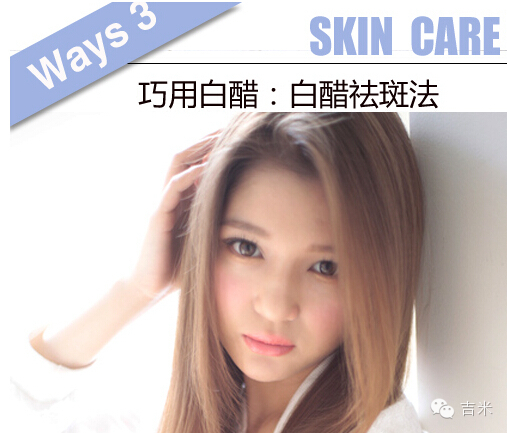 白醋祛斑法:用白醋捣入中药白术适量调和,密封浸泡一个星期。洗脸后,擦拭到长斑的地方。日久可令雀斑逐渐消除、隐退。