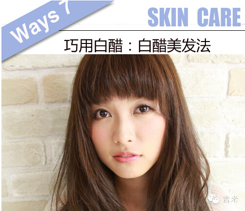 白醋美发法:每次以中性洗发液洗发后,再用对入少量食醋的温水漂洗头发,20分钟后用清水冲洗。慢慢地,头发会变得柔软光泽、乌黑亮