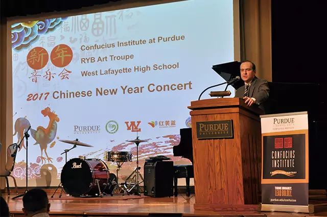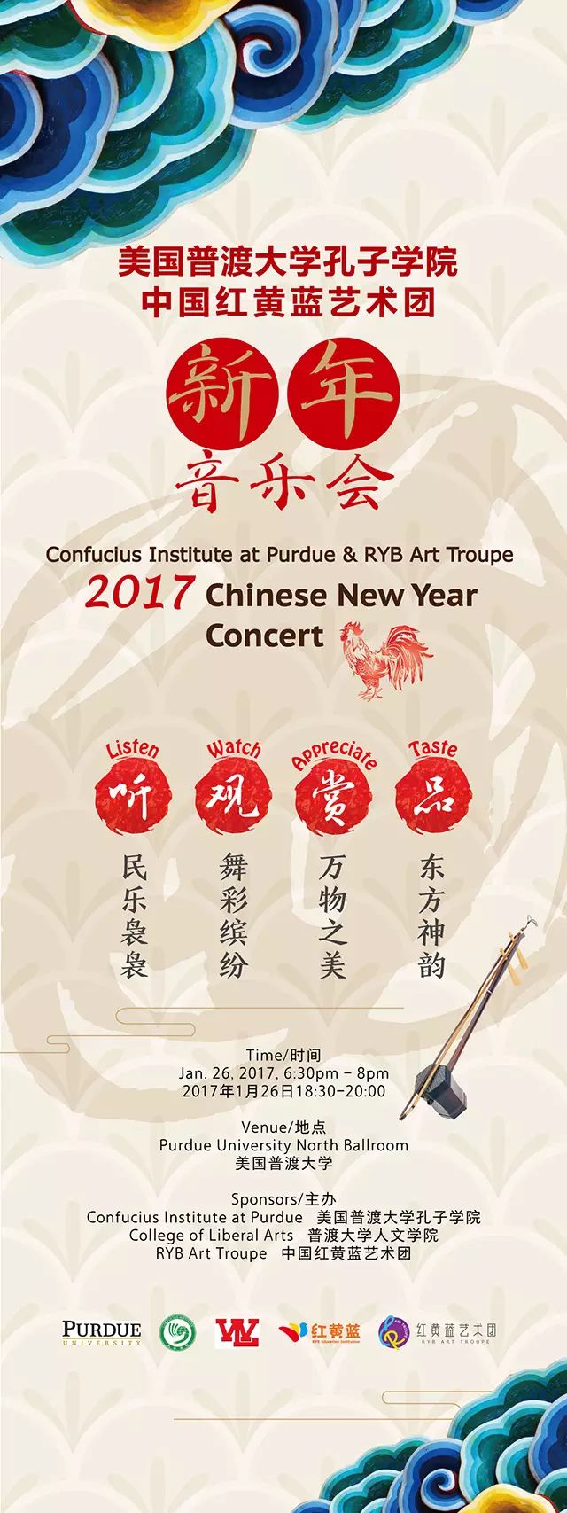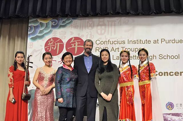 美国东部时间2017年1月26日(北京时间1月27日),红黄蓝艺术团受邀走进美国普渡大学,与普渡大学孔子学院、美国西拉法叶市高中乐团在普渡大学音乐厅共同举办“2017中国新年音乐会”,为观众带来一场凝聚中西艺术精粹的音乐盛宴。西拉法叶市市长、普渡大学人文学院院长、拉法叶市教育局负责人以及中小学校长们观看了演出。