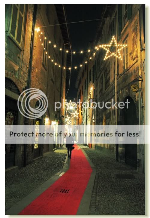 本市最古老的一条街年年圣诞节都要铺上红地毯,看着倒还暖和,就是人影太少了。这巷子里原来有家我喜欢的中餐馆,老板娘原来是杭州建筑设计院的,嫁了意大利先生,可是这几年中餐生意也不好做,她就把店卖了做别的事去了。同一位置上现在是一家西餐馆,上面红地毯上有一个亮着的图案,是那家西餐馆打的广告灯影。
