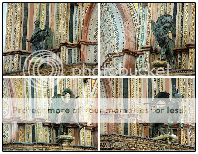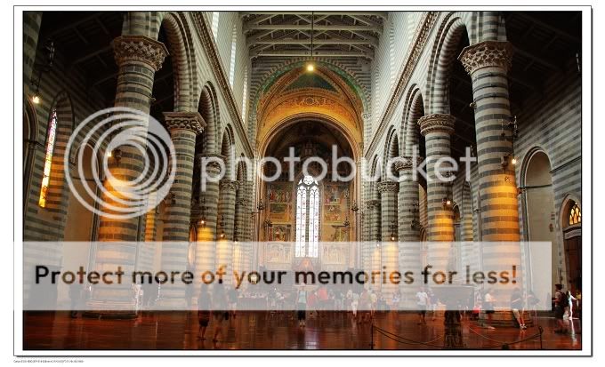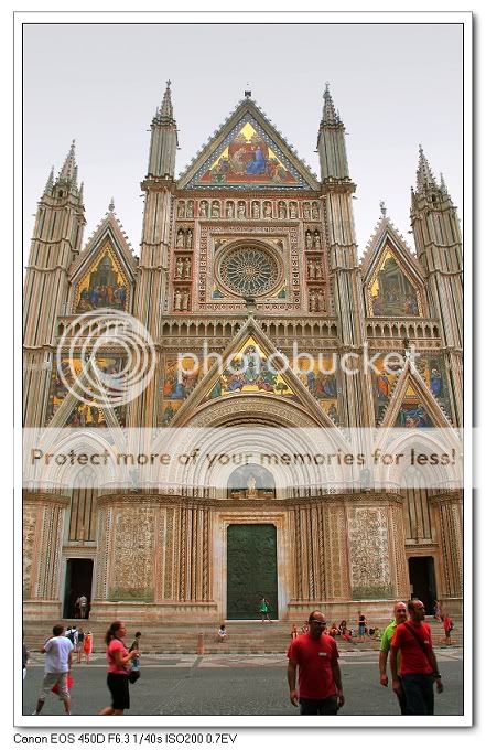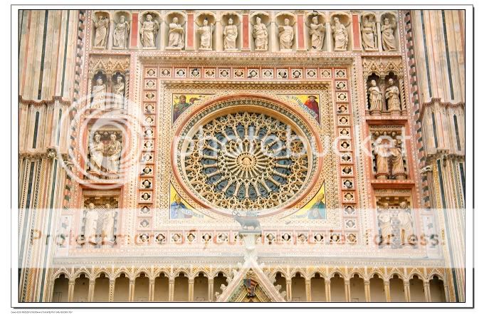 ORVIETO的重头戏是它美丽的大教堂。据说,一位波西米亚传教士原本不相信天主教中耶稣的身体化在圣饼里的说法,直到一次他主持弥撒时看到圣饼渗出血液,从此他相信了奇迹,天主教圣体节也从此被教会确立下来。据说这块圣饼的一部分后来到了ORVIETO, 为了保存它,ORVIETO从1290年起花了一百多年的时间建了这座辉煌的大教堂。我第一眼看到它的时候,觉得它跟锡耶纳的大教堂很象,看了陈教授的书才知道,原来它的立面式样的确是参考锡耶纳的,它们是姐妹作。“不过,奥维埃多的更好。”陈志华教授如是说:“立面的划分更顺畅,上下气势更贯通,构图更完整,比例更和谐,缓急更有节奏,同时色彩也更丰富。”