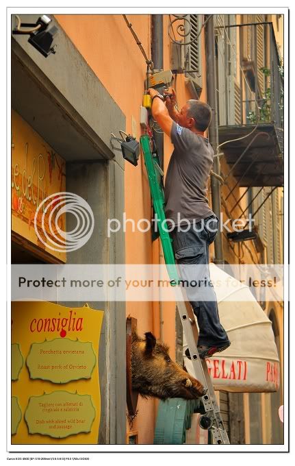 这个挂着野猪头的门面就是我们午饭的餐馆。吃野猪肉是ESTRUCAN文明的古老传统,那天中午俺给风同学点了一份用野猪肉肉酱调味的意大利面。