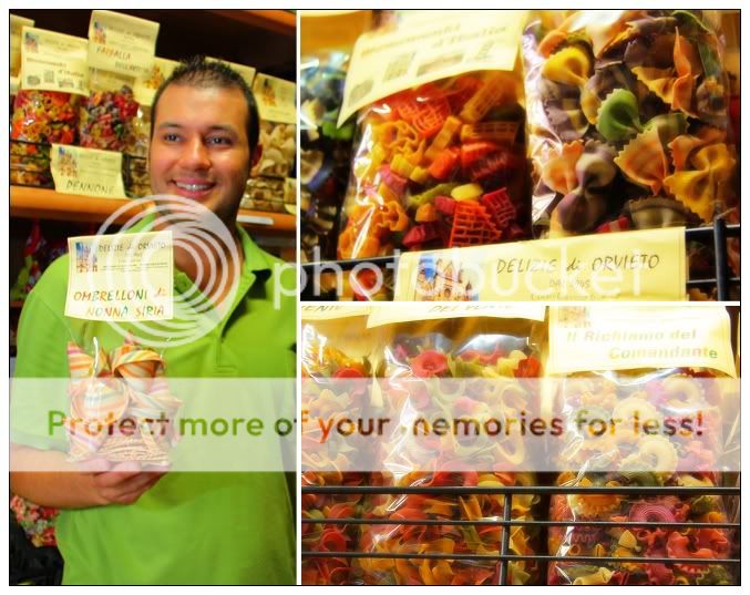 这个笑眯眯的小伙儿叫弗朗切斯科.培拉(FRANCESCO PERRA), 他在ORVIETO市中心拥有一家非常可爱的面条店delizie di Orvieto。小店是弗朗切斯科的奶奶斯丽娅(SIRIA)在1945年创建的,生于1982年的弗朗切斯科从小就爱放学后到店里帮忙。这是一个非常富有想象力的年轻人,在意大利这么多年,也算见识过意大利面的千奇百怪,却从没见过象这家店里的面条造型那么丰富,色彩那么斑斓,蝴蝶,帽子,贝壳,螺旋,波浪......五颜六色,可爱之极。小伙子说,所有这些品种都是他设计的。这是一个把面条做成了艺术品的人。他代表了我所认识的相当大一部分意大利年轻人,固守着非常传统的家族产业,也不奢望把产业扩张成连锁巨无霸,只是想把东西做成世界上最独特最好的。很难说这种观念是对还是不对,意大利人有世界上最好的PIZZA,咖啡和冰淇淋,但是PIZZAHUT ,星巴克,哈根达斯都是美国人的;澳州和美国等“新世界”的葡萄酒只凭一两个大规模生产的品牌就打遍世界,而被称为“旧世界里的旧世界”意大利酒庄们依然固守着祖传秘方手工制作,骄傲地宣称只给“懂酒的人欣赏”。不过,弗朗切斯科毕竟也是80后新一代了,比起前辈多了一些营销的概念,当我把照片发给他,他用书写错误颇多的英语邮件对我进行了感谢,并且发给我好几个宣传他的小店的网站地址。