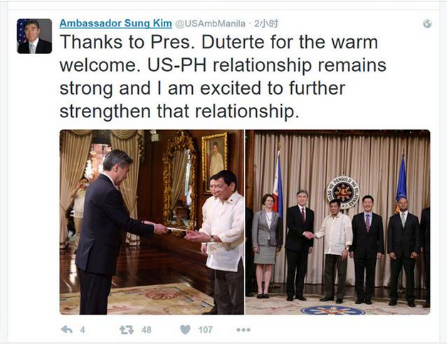 就在两天前(17日),杜特地还在他的家乡达沃市的一场记者会上称赞美国大使金圣镕(Sung Kim),“他们有一位非常好的韩国裔大使,他非常谦恭有礼。”