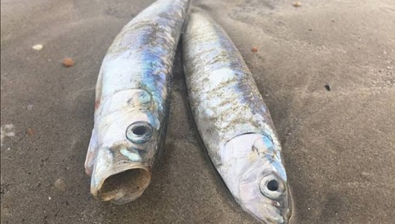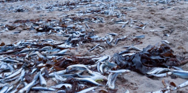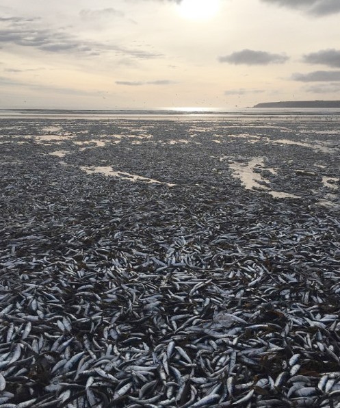 根据《每日邮报》报导,一位遛狗的当地人于17日在英国康沃尔(Cornwall)的Marazion海岸边散步,赫然发现超大片的鱼群,张开嘴巴地躺在沙滩上,但奇怪的是,他说:“这些鱼看起来很新鲜,非常喜欢吃鱼的海鸥及我的狗却都不想吃。”。