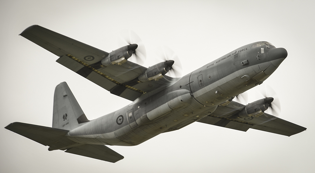 (在“圣诞空投行动”中,一架澳大利亚皇家空军的 C-130J“超级大力神”运输机正从关岛安德森空军基地起飞。)