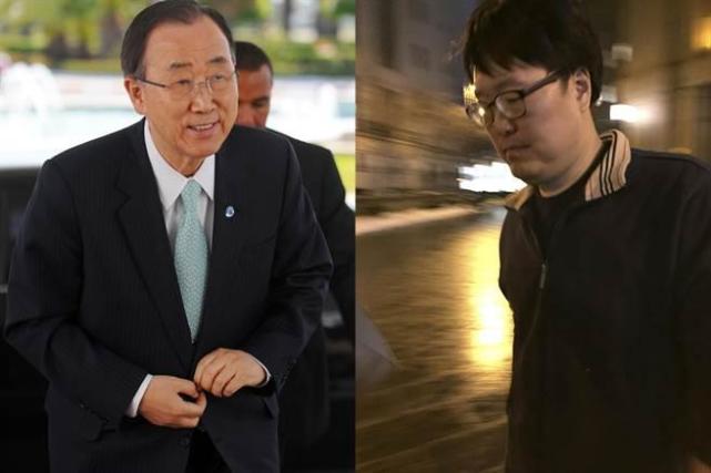 联合国前秘书长潘基文2016年3月29日的资料照。(右)潘基文的侄子2017年1月10日离开美国纽约联邦法院的神情。