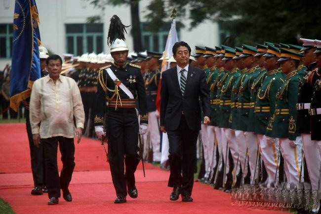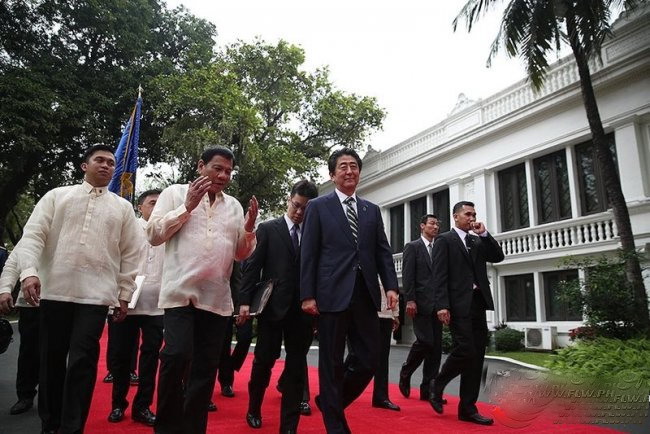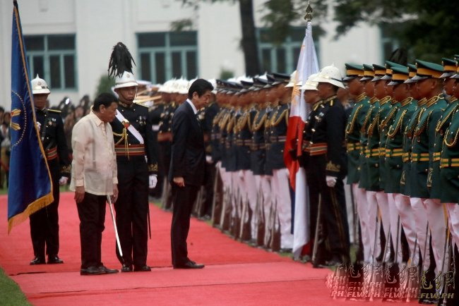 菲律宾总统杜特尔特与来访的日本首相安倍晋三,12日在菲律总统府宾马拉坎南宫见证了5项合作文件的签署,两国将加强在社会经济发展、海事安全、交通、农贸等领域的合作。