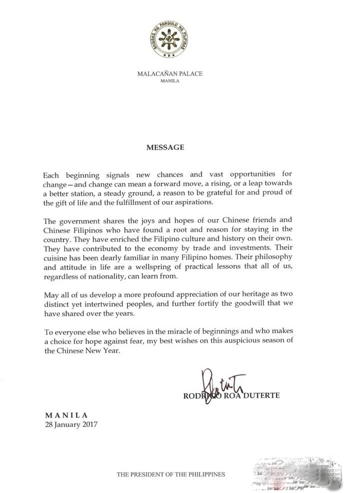 杜特尔特总统的2017年春节贺词的全文如下: