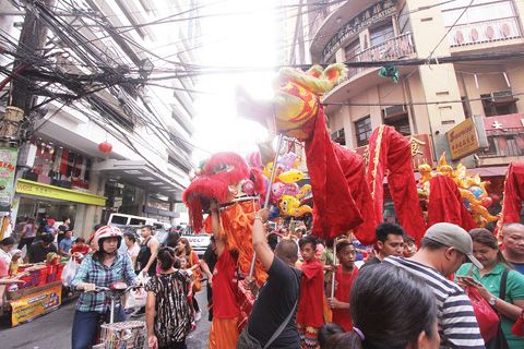 马尼拉华人聚集的王彬街上的舞龙舞狮表演