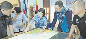 中国驻亚庇总领事陈佩洁(右三)与马国救援单位研究海上搜救部署。