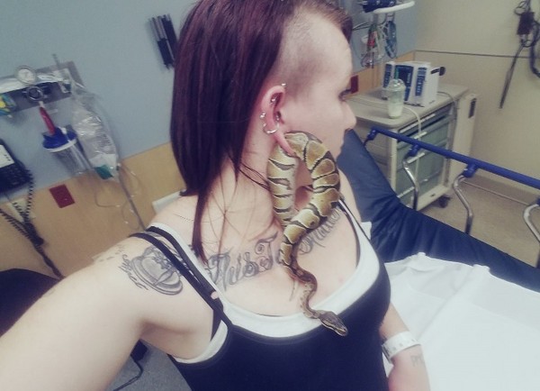 美国一名女子日前在家中和自己的宠物蛇玩耍,不料,宠物蛇竟钻进她扩大的耳洞内动弹不得,她赶紧奔赴医院求救。