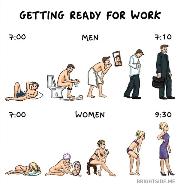 男人准备出门上班,只需要10分钟就能蹲完厕所、换好衣服潇洒步出家门,女生却要花上两个半小时,到底为何差这么多,你应该心理有数!