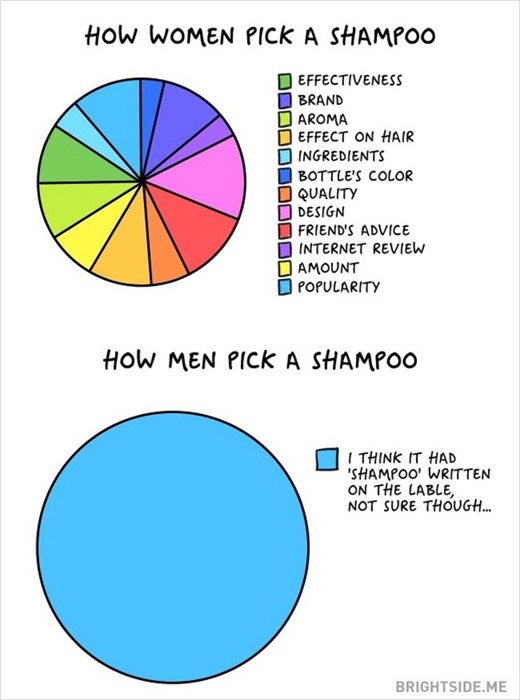 男女个性很不同,到购物行为也能见证,同样选洗发精,男生随便抓一罐都可以用,女生则会考虑品牌、朋友推荐、香味、成分、功能,甚至连瓶罐的设计都是考量之一。
