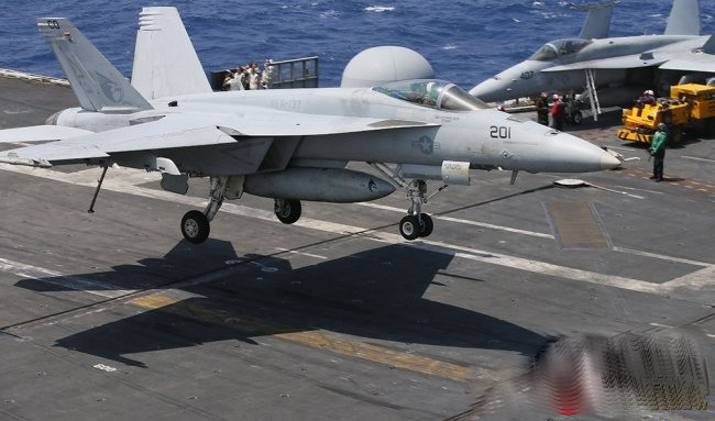 美国航母卡尔文森号上的一架战机起飞。