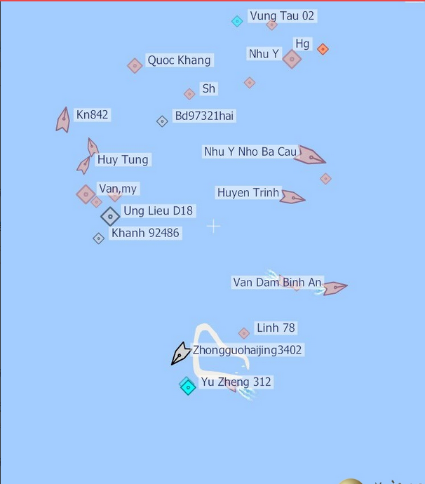 美国提供的黄岩岛卫星定位图,可见到中国海警3402和渔政312驻守黄岩岛潟湖。黄岩岛周边拥有众多越南渔船。(黄胜友注)