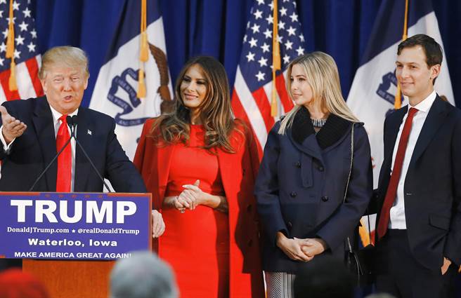 特朗普、梅兰妮亚、伊凡卡、库许纳竞选期间在台上发言。