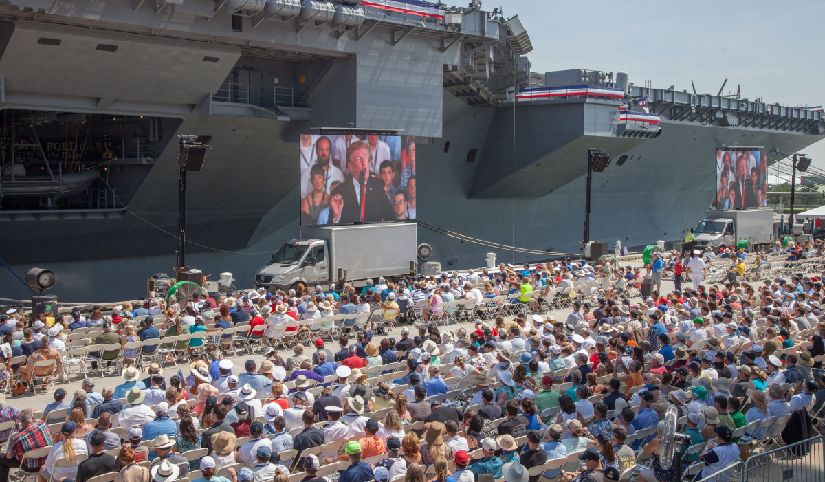 美总统特朗普在仪式发表演讲:“无论这艘船在何处的地平线上出现,我们的盟友都会轻松、放心,我们的敌人都会怕得发抖,因为每个人都会知道美国来了,美国正在强势来临。”还说这艘军舰是一种“使我们不必战斗的威慑”,若真发生战争“结果永远都是一样的,那就是,我们将胜利,胜利,胜利。”