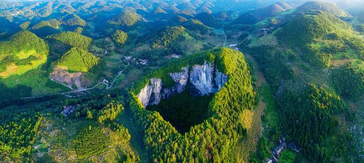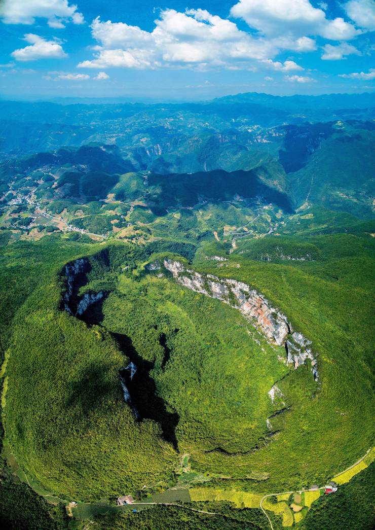 在湖北省恩施土家族苗族自治州利川市与重庆市奉节县交界处,一个巨大的天坑隐匿在大山深处。行政区划上以山脊为界分隔了重庆东部与湖北西部,但从喀斯特地貌的角度来看,两者其实是一脉相承的。这个天坑体量极其巨大,生活在附近的村民们一直称其为“崖”。只有通过无人机从空中航拍,你才会发现它其实是一个四围闭合、崖壁陡直的大凹坑,即符合天坑的科学定义。通过实地测量,这个椭圆形大天坑的最大直径超过了1000米。