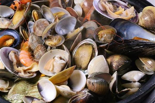 用一个小铁桶装满了时令的海鲜,鲍鱼,扇贝,生蚝,青口,明虾,还有白贝,服务员一股倒到桌子上,我的天啊,这也太野性了吧,这就像我们在海边用餐桌纸铺在沙滩上,煮熟的海鲜就一把倒在上面,带上手套徒手抓,点酱放入嘴里。