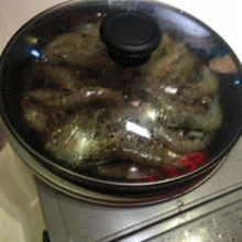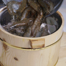 把生猛的鲜虾放入滚烫的石头里,再加点酒烧一下。