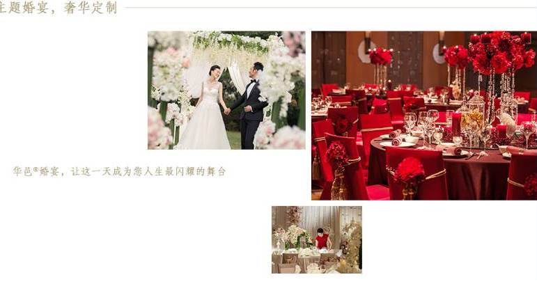 高档奢华的婚礼场地,灵活宽敞的空间。无论是唯美的西式、优雅的中式、亦或是浪漫的户外主题,各种风格的婚宴都能够在这里得以度身定制。具有丰富经验的华邑婚宴经理,从与新人接触的第一刻起,将悉心了解宾客细腻需求,从筹备到婚宴当天的每一个细节,提供专业周到的服务与建议,只为助您实现梦想中的唯美婚礼。