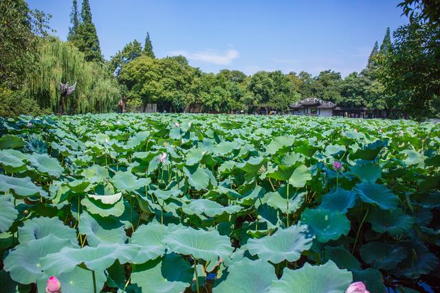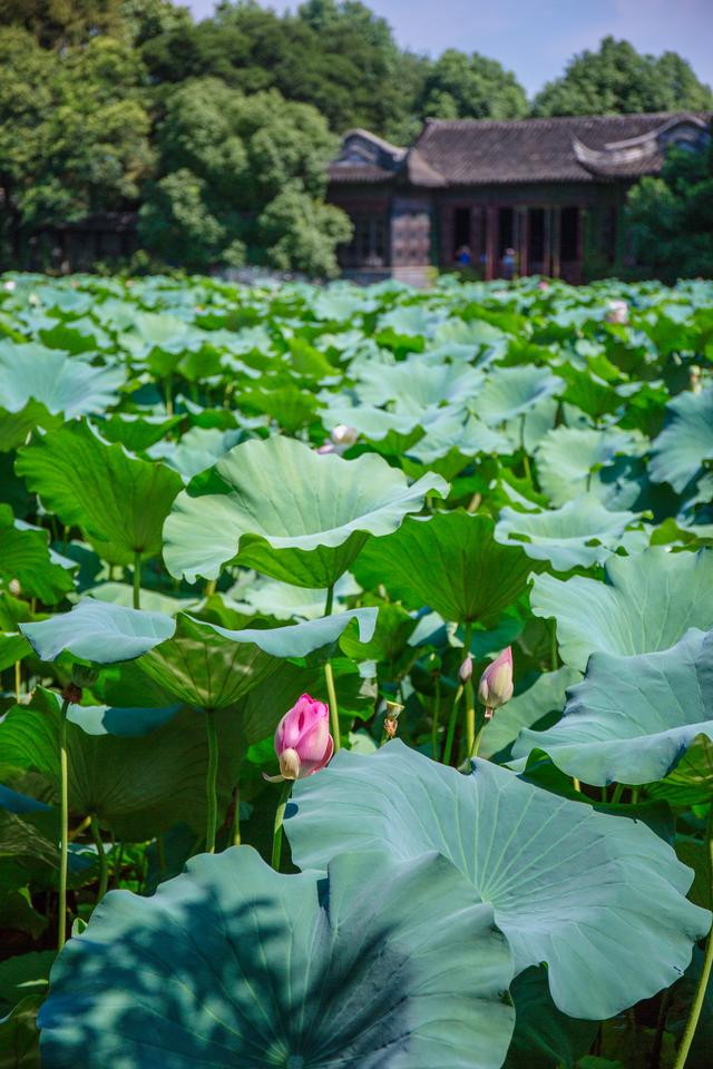 我们去的时候正是夏天,蓝天映衬下的一池碧绿荷叶,让人心情不禁大好,不禁想起了那句诗:映日荷花别样红。