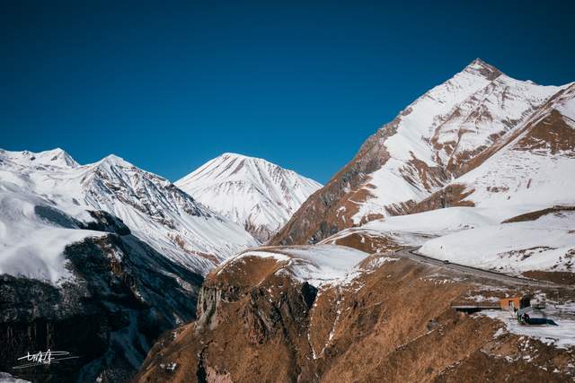 作别古道里,一路沿着军事大道继续往前,一路的蓝天白云相伴,雪山在我们车前,一路的好心情。没过多久就到了第二个标志性的景观:俄格友谊纪念碑,这是格鲁吉亚典型的半圆形碉堡式的建筑。