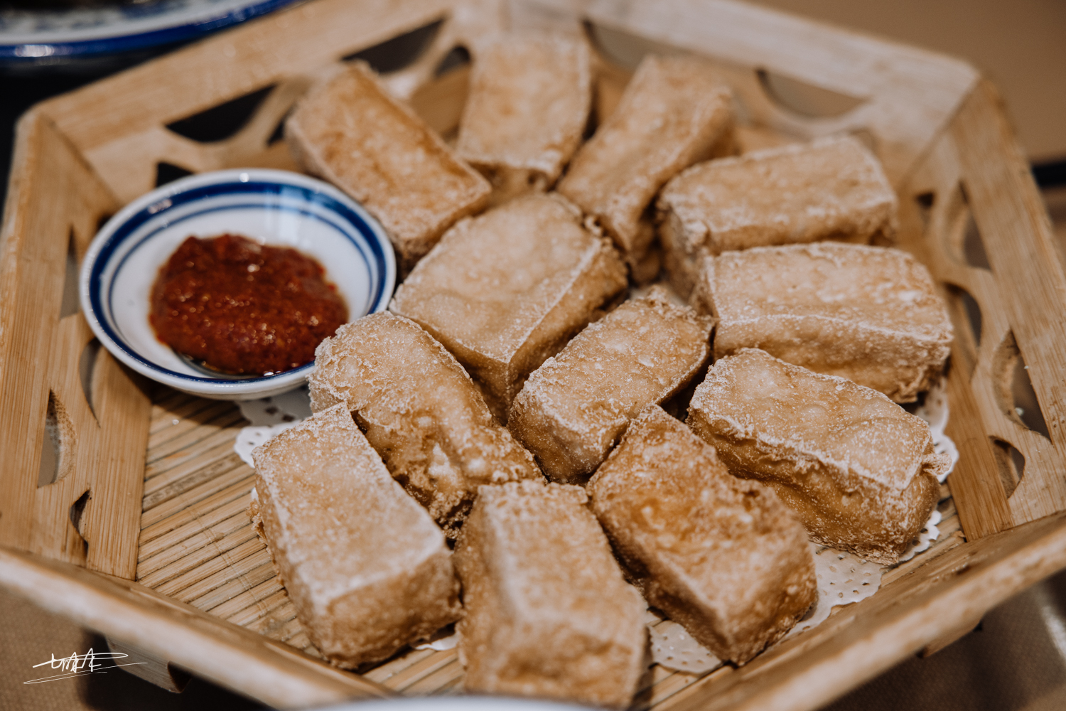 炸金砖究竟是一道什么菜呢?其实就是一盘炸豆腐。把豆腐干炸的酥脆金黄然后配上特制酱料,我感觉看起来跟臭豆腐差不多,只能说土豪家的臭豆腐也充满铜钱味。