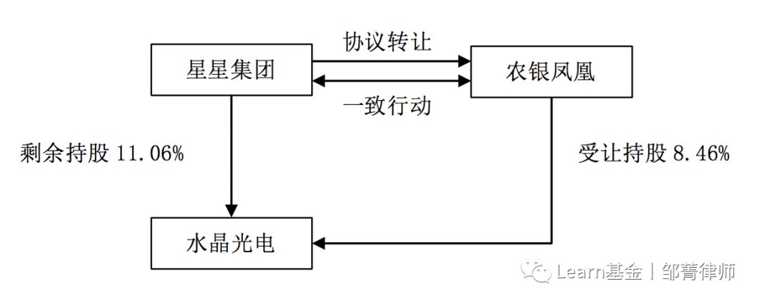 值得关注的是,作为股票受让方的农银凤凰明确同意与作为出让方的星星集团签署一致行动协议,两者在持股期间将构成一致行动人,并最终以出让方星星集团的意见为准。可见,本次协议转让不仅未涉及水晶光电控股股东的变更,甚至未对出让方的表决权构成实际影响。本次交易的基本结构如下: